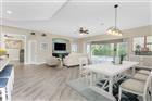 One or more photo(s) has been virtually staged. Discover effortless coastal living in this beautifully updated expanded & modified Everett floor plan, nestled in the highly coveted Courtside Landings neighborhood of Burnt Store Marina. A charming screened front porch welcomes you home, setting the tone for the thoughtful upgrades found throughout—including a NEW METAL ROOF that was added in 2023. Inside, diagonal-set LVP flooring guides you into a completely reimagined, open-concept living space that provides the ultimate flexibility for living and is being offered partially furnished for your convenience. The striking redesigned modern kitchen features an expansive flush island with ample bar seating, oversized dual-tone flush panel cabinetry with abundant drawer storage and tasteful quartz tops. A stylish herringbone tile backsplash is the perfect compliment, with stainless steel appliances and farm sink. A convenient wet bar complete with wine fridge adds a pleasing feature for entertaining. The open concept makes for easy living and is anchored by an illuminated entertainment niche with an adjacent convenient half bath, ideal for guests. A full wall of pocketing sliding glass doors dissolves the boundary between indoors and out, revealing your private outdoor oasis. Enjoy a newly installed paver pool deck, spacious covered seating areas, a dedicated grilling zone, and lush tropical landscaping that creates a secluded retreat around the sparkling pool ( resurfaced roughly 5 years ago). The thoughtful layout includes three guest bedrooms including one that is a converted den with double French doors and an added closet for. A cheery guest room is located in the front of the house with an adjacent full bath. The serene primary suite, painted in calming coastal hues, offers direct lanai access, plantation shutters, and tranquil pool views. Its en-suite remodeled bath features dual sinks with an upgraded roman tiled shower. Additional highlights include complete hurricane protection with accordion shutters, a roll-down lanai shutter, and a hurricane-rated garage door. This location is a short stroll to fabulous resort style amenities, including Cass Cay Waterfront Restaurant, the Tennis and Fitness Center, and the Harbormaster’s office. Burnt Store Marina’s 27 hole golf course and Linkside Cafe are also a bike or golf cart ride away … with opportunities to socialize and meet neighbors. Burnt Store is SW Florida’s largest deep water marina with immediate access to Charlotte Harbor and just 10 nautical miles to the golf. If you are looking for a great resort lifestyle…this is the one!