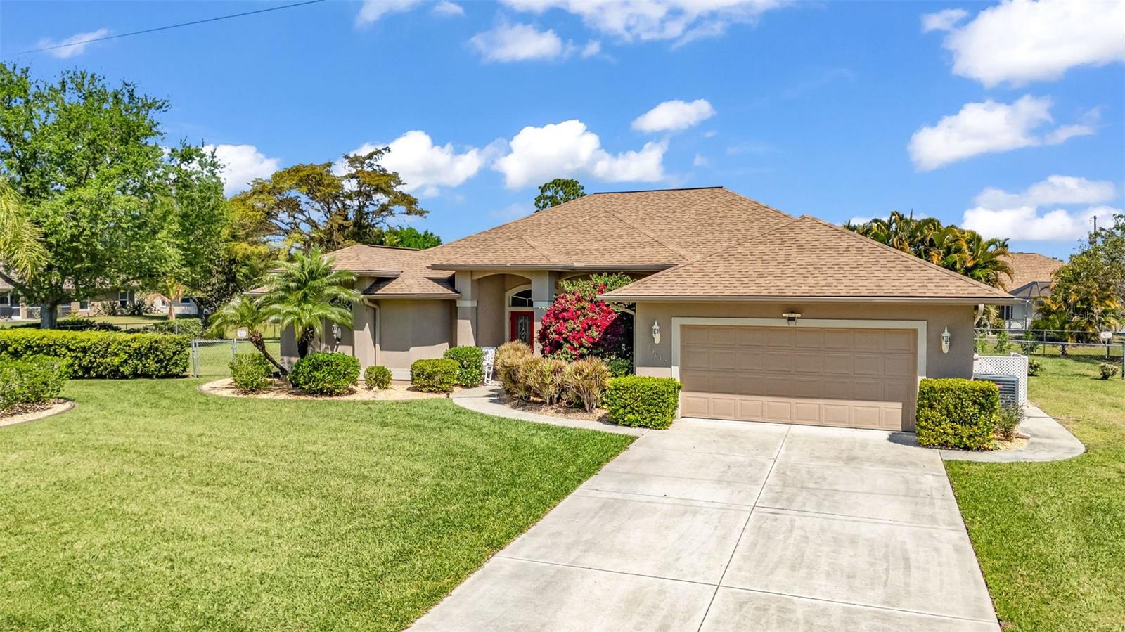 This GORGEOUS Double Lot (A 3rd Lot next door is available / It’s NOT included at this time of listing) 4 bedroom-3 bath pool home is going to make some future owners very, very happy. Located in the deed-restricted neighborhood of Deep Creek, you'll love everything about this beautiful home that includes the vacant lot to the left of it. Filled with LIGHT, this well-maintained home has loads of upgrades and features. The bright, roomy kitchen has solid wood cabinets and granite counters. Stainless steel appliances. Breakfast/eating counter. Plant shelves will hold your plant collection or any other decor that you'd like to display. The primary bedroom has sliding doors leading out to the lanai and pool area and tray ceilings. The ensuite bathroom features a luxurious garden tub and dual sinks. A separate water closet makes the space even more functional. Large walk-in closets have room for lots of clothing and storage. 3 additional bedrooms provide all the space you need for your household. The dining room overlooks a landscaped yard and features a huge front window. The dining nook next to the kitchen has an INCREDIBLE AQUARIUM WINDOW that lets in abundant light and looks out onto the lanai and pool area. See individual pool pictures pertaining to pool updates. Separate well for irrigation system. You will spend many amazing days and evenings in the POOL and SPA, which is abutted by trees for full privacy. The large parcel includes the vacant lot to the left of the home. There is also another vacant lot to the right of the home that is available for purchase as well. Please contact agent for more details. Deep Creek is a deed-restricted neighborhood located close to Interstate 75, which gives you easy access to all the best of southwest Florida. Shopping and dining is located within a 5-minute drive, and additional dining hotspots like downtown Punta Gorda are no more than 15 minutes away. Additionally, Charlotte County's local airport is home to Allegiant Airlines which affordable flights to numerous destinations all over the country. This home is MOVE-IN READY! Call now to schedule a private showing!