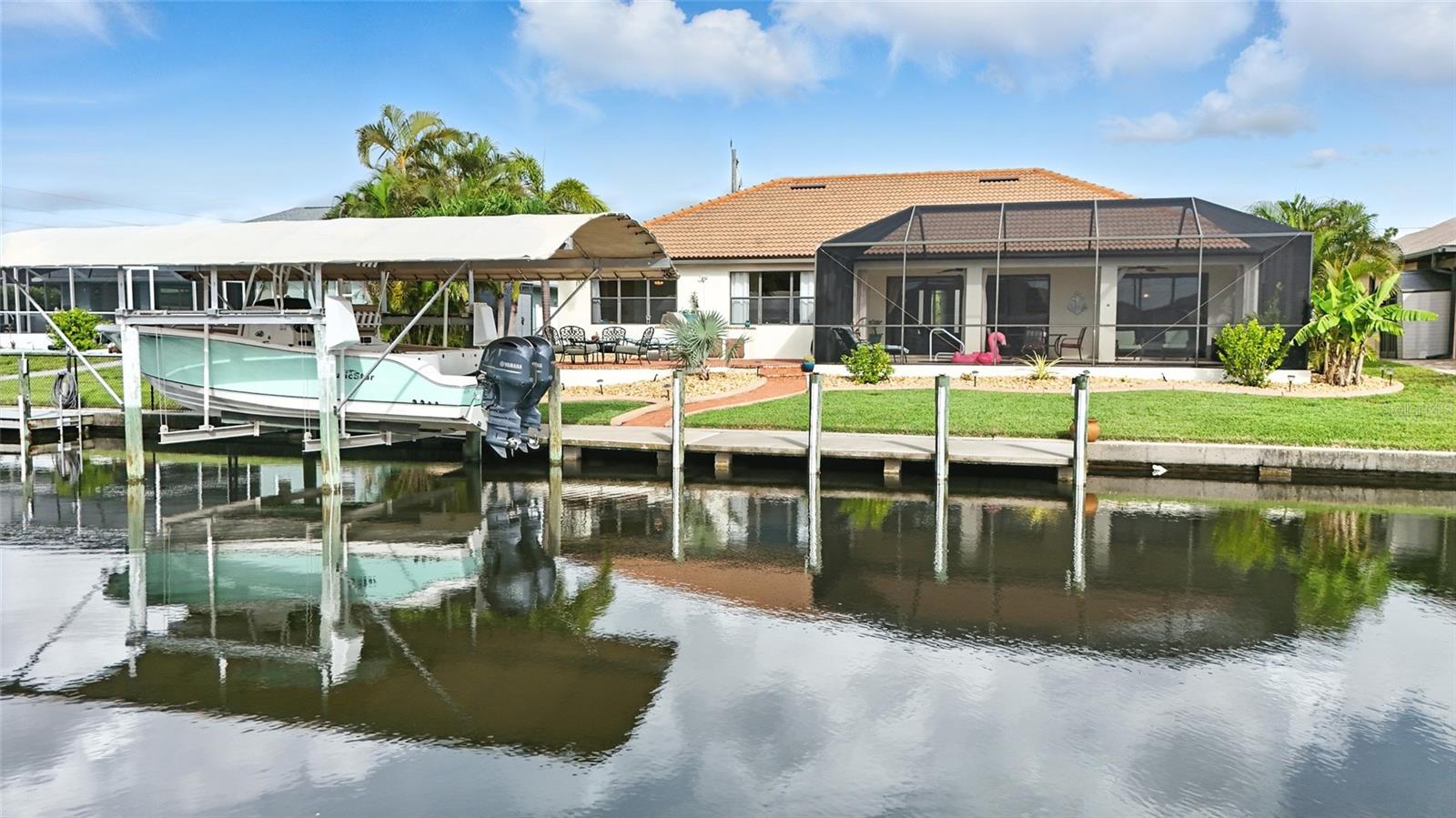 Welcome to your waterfront escape in highly desirable South Gulf Cove—where boating, sunsets, and Florida living come together. This beautifully maintained 3-bedroom, 2-bath home offers 120 feet of concrete seawall, a private dock with water and electric, and a 13, 000 lb covered boat lift with access to over 55 miles of canals leading to Charlotte Harbor and the Gulf. Inside, enjoy an open split-bedroom floor plan, high ceilings, and a spacious screened lanai overlooking your heated pool—perfect for entertaining. Recent updates include a 2023 roof and modern appliances. Offered furnished for a turnkey experience, with optional boat package available—start enjoying the Florida lifestyle from day one. Located just minutes to Boca Grande, beaches, golf, and marinas. Priced to move—schedule your private showing today.