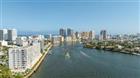 Direct intracoastal condo offering unmatched views and location! Enjoy breathtaking water and skyline views from this exceptional 2-bed, 2 bath condo, just steps from the beach! Watch yachts glide by from your private terrace and enjoy a spacious light-filled interior with wood floors, floor-to-ceiling sliders, an open kitchen with a breakfast bar, and a luxurious primary suite featuring a stunning water view, walk-in large closet, double sinks and a large shower. Washer and dryer in the unit. Bayshore towers offers resort-style living with a heated saline pool, fitness center, clubhouse, saunas, BBQ area, covered parking and dock access. Perfect as a full-time residence, vacation getaway or investment. World-class dinning, shopping and entertainment just minutes away!