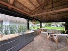 Welcome to your tropical RV oasis! Rare find combining comfort, style, and resort-style living! Enjoy the impressive 30’ x 15’ tiki hut with electric shutters and mosquito screens, installed 2023, ideal for relaxing or entertaining. Custom shed includes: Murphy bed, full bathroom w shower. Extra storage for ultimate convenience. Lot comes fully furnished with a living room set, bistro table, high-end American teak dining table with 6 chairs (invoice available). Golf cart with brand-new batteries is also included! Room to expand with options to add a rear extension or balcony for even more outdoor living space. Nestled amid lush tropical landscaping in a friendly community, this property is turnkey and ready for your RV lifestyle, whether as a seasonal escape or your full-time paradise!