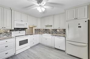 This beautifully updated condo is ready for immediate enjoyment. The custom kitchen is a highlight, featuring granite countertops, a farmhouse sink, crown molding, and a decorative backsplash. Durable vinyl flooring flows throughout the entire home, which has been freshly painted for a bright, clean look. The master bathroom has been updated, and you'll find abundant storage with huge walk-in closets and a massive utility room complete with a full washer and dryer. Relax on the expansive lanai and take in the picturesque lake views. Peace of mind is guaranteed: the Roof and Elevator are NEW and fully paid for by the Seller, and the A/C was replaced in 2022.