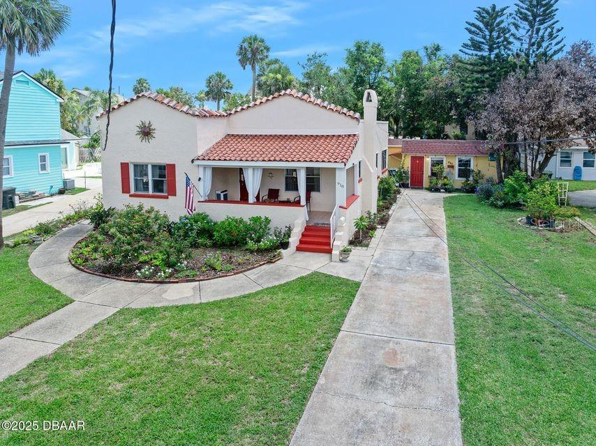 HISTORIC DAYTONA BEACHSIDE... This captivating, one of a kind, 1918 Spanish-inspired residence offers a unique blend of historic charm and modern updates and a NEW ROOF in 2025. The interior features arched openings, high ceilings, intricate woodwork, and a decorative fireplace with a mosaic-tiled hearth. The mid-century kitchen, boasting ample light and storage, complements a spacious formal dining room equipped with built-in shelving and storage. Beyond the inviting living room, you will find a generously sized guest bedroom, the sun-drenched ''sunroom'', a convenient hallway lavatory, a sizable primary bedroom suite, and a versatile den/office/laundry room with direct access to the backyard and outdoor shower. The property has been meticulously maintained with annual inspections, including a recent exterior painting, updated electrical in 2022 and a new AC and water heater in 2021. Additionally, a spacious one-bedroom, one-bathroom apt or guesthouse, ideal or income production, features newer AC units and is currently occupied by a long-term tenant who wishes to remain. This desirable location, with NO HOA, offers convenient beach access just 4 minutes away, near the Hard Rock, the Seabreeze entertainment corridor, lots of restaurants and pubs, the Bandshell, boardwalk, fishing pier, and the World's Most Famous Beach. All information recorded in the MLS is intended to be accurate but cannot be guaranteed.