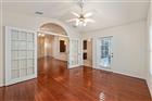 Under contract-accepting backup offers. Enjoy low-maintenance living in Vista Palms at Mile Run in this spacious 3 bedroom, 2 bath home with a flexible bonus room and one of the larger lots in the neighborhood. The layout offers both openness and privacy, with guest bedrooms and a full bath positioned near the front of the home and the primary suite tucked away on the opposite side. One of the front bedrooms features double French doors, making it a natural fit for a home office, craft room, or den. The main living area feels bright and comfortable with vaulted ceilings, Pergo flooring, and an easy flow between living, dining, and kitchen spaces. A freestanding natural gas fireplace adds warmth and character to the living room and serves as a cozy focal point for the space, while French doors lead to a bonus Florida room that can be closed off for additional workspace, a reading room, or a quiet retreat. The kitchen has been updated with 42-inch cabinets, stainless steel appliances, and solid surface counters, and features a breakfast nook overlooking the backyard. Large windows throughout bring in natural light and give the home an open, airy feel. The primary suite includes new carpet, a walk-in closet, and an en suite bath with double sinks, a jetted tub, and a separate shower. An interior laundry room with washer and dryer adds convenience, and the two-car garage offers a workbench and extra storage. Out back, the open patio looks onto a generously sized yard with mature trees and space to relax or entertain. Residents of Vista Palms enjoy exterior maintenance handled by the HOA, including exterior pressure washing and exterior paint, along with front and side yard care. The community also offers a pool, tennis and pickleball courts and a playground, and is conveniently located near shopping, restaurants, parks, and an easy drive to UF, Shands, and north Gainesville employers. This is a comfortable, well-cared-for home in a neighborhood known for its amenities and easy living.