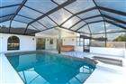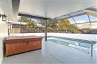 One or more photo(s) has been virtually staged. Experience refined living in this beautifully renovated residence designed for both elegance and comfort. This exceptional 4-bedroom, 3-bath home has a newer roof and AC as well as featuring a desirable split floor plan, soaring ceilings in select areas, and an abundance of natural light that enhances the home’s open, airy feel. The designer kitchen is a true showpiece, appointed with all-new custom cabinetry, sleek quartz countertops, premium appliances, and an expansive peninsula ideal for upscale entertaining and casual dining alike. Luxury vinyl flooring flows seamlessly throughout, complemented by new designer fans, fixtures, and finishes. The primary suite serves as a private retreat, offering a spacious walk-in closet and a spa-inspired en-suite bath with double vanities and an oversized walk-in shower. A second en-suite bedroom provides the perfect guest or multi-generational suite, thoughtfully positioned for privacy. Step outside through two sets of sliding glass doors to your own resort-style oasis. The covered lanai overlooks a private, fully screened swimming pool with an in-ground spa, creating the ultimate setting for relaxation and outdoor entertaining. The fully fenced backyard enhances privacy while maintaining a serene atmosphere. Additional highlights include an indoor laundry room, an attached two-car garage, and an oversized driveway providing ample parking. This move-in-ready home offers sophisticated finishes, functional design, and luxurious indoor-outdoor living.