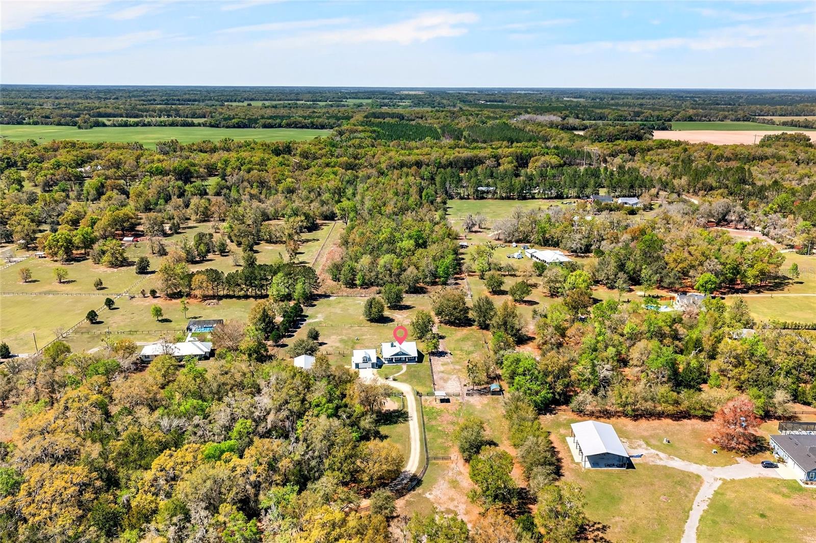 Welcome to peaceful country living in the heart of Newberry, Florida. Situated on 5.09 fully fenced acres, this beautiful farm offers the perfect balance of comfort, functionality, and open space. Ideal for horse owners or those seeking a private country setting without sacrificing convenience, the property also includes a detached 1-bedroom, 1-bathroom in-law suite with an attached climate-controlled 2-car garage—perfect for guests, extended family, or potential income. The 3-bedroom, 2-bathroom main home features 1, 584 square feet with a thoughtfully designed split floor plan that provides both privacy and an open, fluid living space. The spacious primary suite offers a large bedroom, generous closet with attic access, and an ensuite bathroom complete with a walk-in shower and relaxing soaking tub. The main living area is warm and inviting with a wood-burning fireplace, creating the perfect place to unwind after a day outside. The beautifully appointed kitchen includes all appliances, with the refrigerator being only two years old. The washer and dryer are included for added convenience. Two additional bedrooms are located on the opposite side of the home, making the layout ideal for family or guests. Step outside to the screened-in back porch, where you can enjoy Florida evenings protected from the elements, or gather around the fire pit while taking in stunning west-facing sunset views across your property. Designed with equestrians in mind, the farm features a 3-stall barn with wash rack, along with a lockable tack room and feed room. The property includes four main pastures, two run-in shelters, and ample space to add an arena or additional paddocks, offering flexibility for a variety of horse operations. A beautiful in-law suite built just over a year ago provides additional living space and income potential. The 312 sq ft guest residence includes 1 bedroom and 1 bathroom with beautiful finishes throughout and an attached climate-controlled 2-car garage. All construction was fully permitted and completed to code. The property has been meticulously maintained, including fresh exterior paint completed in 2025 and “forever screws” installed in the roof in 2025 for long-term durability. Both homes are bonded for termite and pest protection, offering additional peace of mind. Despite its peaceful country setting, the property offers exceptional convenience. Located less than 5 miles from Publix, Bravo Supermarkets, multiple restaurants, Ace Hardware, coffee shops, boutiques, and a fitness center, you can enjoy the charm and quiet of small-town living without sacrificing everyday amenities. Additionally, there are plans for a Wawa and shopping center coming later this year, just minutes away on SR 26. The farm is also ideally positioned less than 40 minutes from Gainesville and approximately one hour from Ocala, making it easy to access larger city conveniences while still enjoying the privacy and tranquility of your own acreage. With peace, privacy, and breathtaking views overlooking your horses, this property captures the true essence of North Florida farm living while offering the convenience of nearby town amenities.