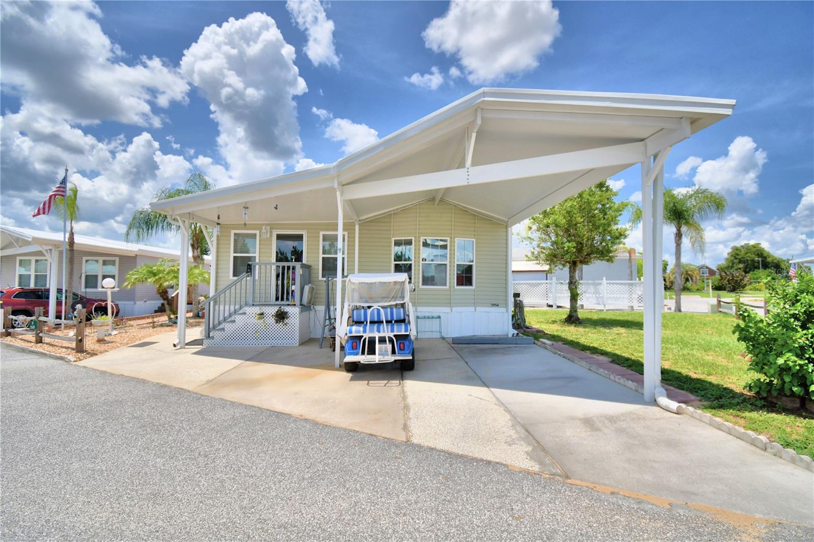 PRICE IMPROVEMENT! WELCOME to WEST VIEW RIDGE a 55+ Community in the heart of CENTRAL FLORIDA and you OWN YOUR LAND. Home located on a WELL-MAINTAINED CORNER LOT with SHED behind home for your additional storage. This home offers 2 Beds/2 Baths. Master Bedroom Bath has walk-in shower and guest bath has a tub/shower. OPEN FLOOR PLAN as you walk in the front door from your covered front porch. Living Room/Bedroom/Bath/Laundry BUILT 2020. Kitchen has LOTS of cabinets & counters. Equipped with a Water Filtration System. Large Dining Room with decorative windows for a wonderful dining experience. Laminate Flooring throughout the home. FULL COVERAGE NEW ROOF MARCH 2024. Metal Carport (INSTALLED 2019) allows coverage for parking of two vehicles and a GOLF CART which CONVEYS WITH HOME! FULL NEW ROOF OVER INSTALLED 2024. FLORIDA LIFESTYLE at it's BEST with this home offering you all the comforts you could want. GATED COMMUNITY WITH TWO ENTRANCES. RECREATIONAL BUILDING/SOLAR HEATED POOL/MANY AMENITIES (MINIATURE GOLF, BOCCE BALL COURTS, PICKLE BALL COURTS, SHUFFLEBOARD, ETC) AROUND THE COMMUNITY. CLOSE TO SHOPPING, MEDICAL, RESTAURANTS AND MAJOR ROADS TO BOTH FLORIDA COASTS. DISNEY WORLD AND UNIVERSAL STUDIOS 20-30 MILES AWAY. MOTIVATED SELLERS!